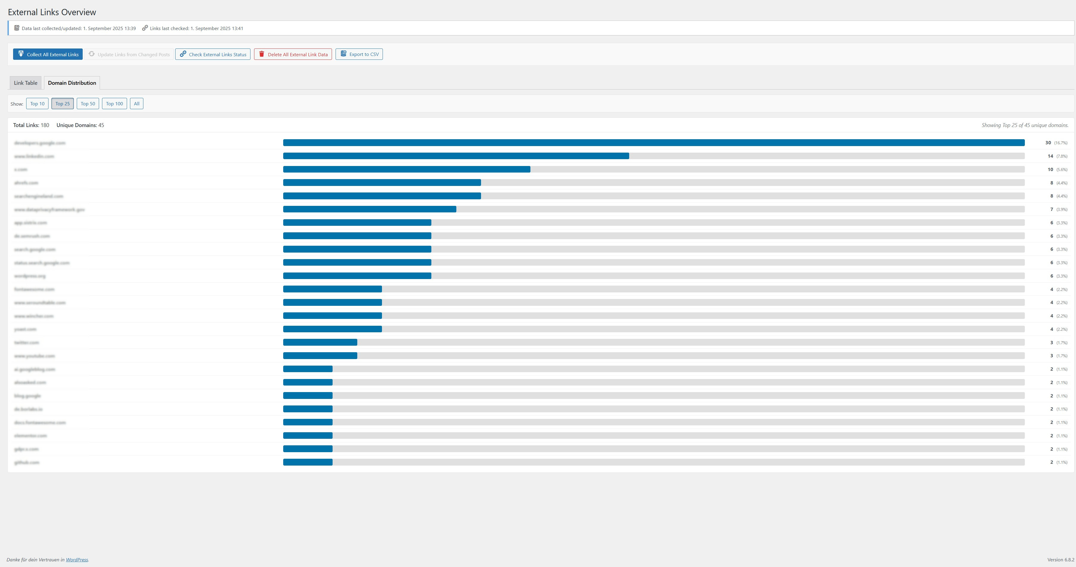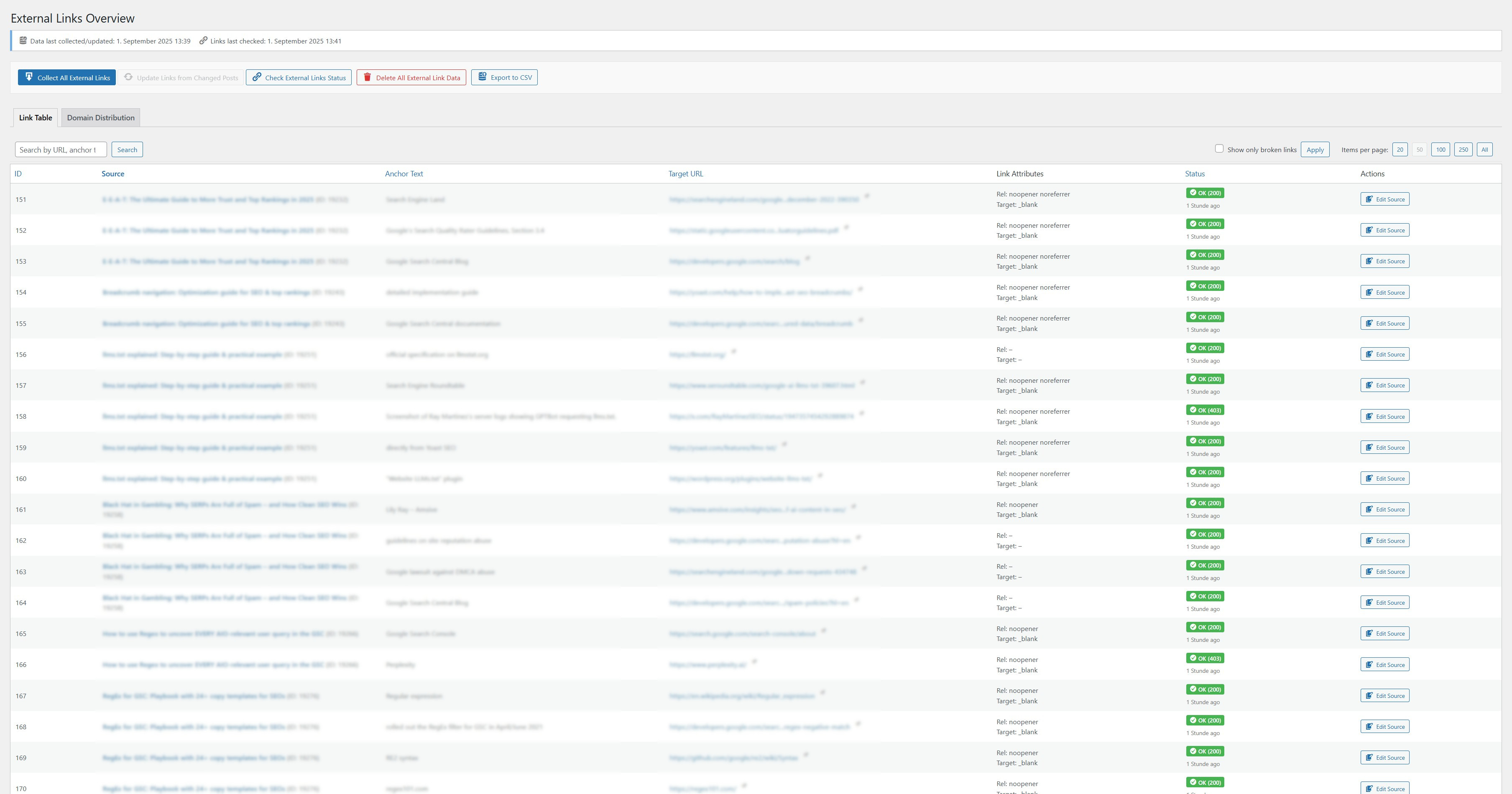 The “External Links Overview” plugin scans your WordPress posts and pages for outgoing external links and presents them in a searchable, filterable, and sortable table. It helps you optimize your outbound link profile and identify broken or potentially harmful links.