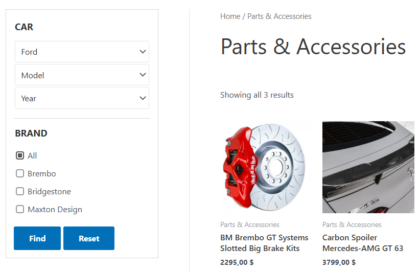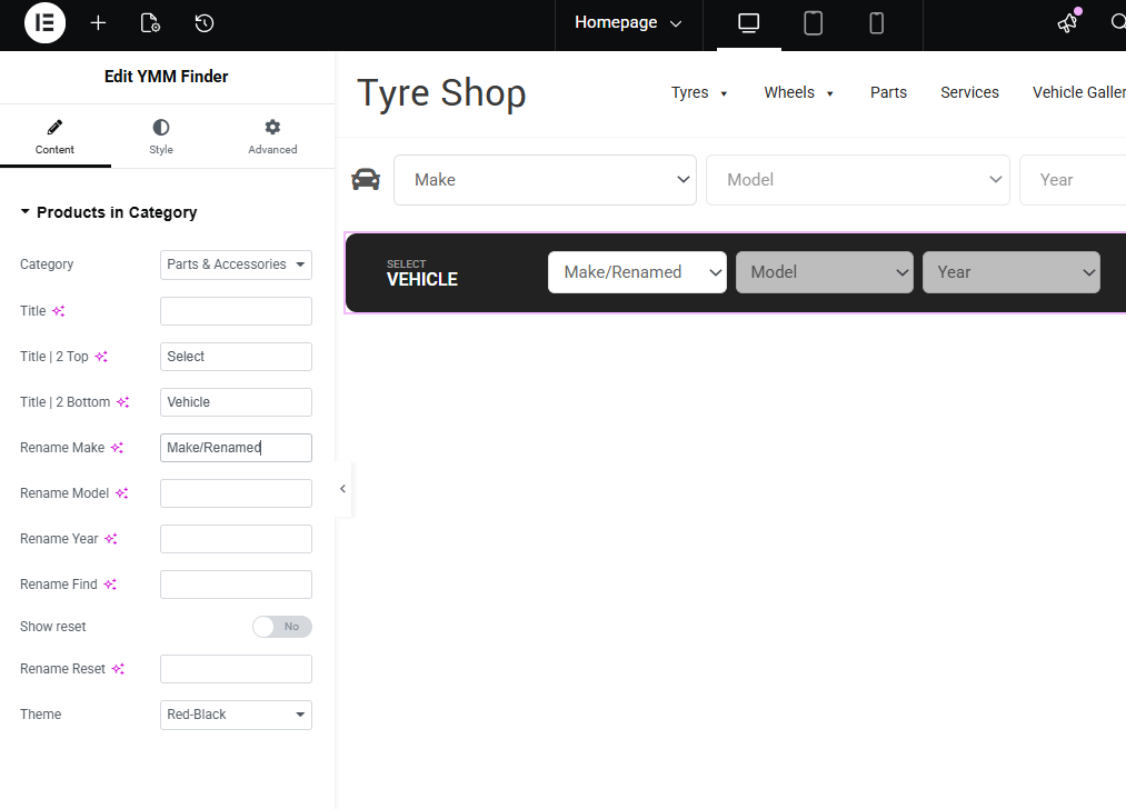 - YMM and MMY Finders – widgets for any pages. Like external UI for Filter, redirects to category